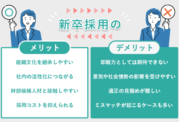 新卒採用には企業にとっても多くのメリットがある一方で、即戦力にはなりにくい点や、適性の見極めが難しい点など、社会人経験がないこと自体がデメリットにつながってしまう場合もあります。