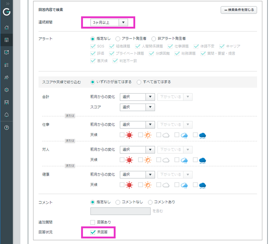 Geppoでは仕事・対人・健康の3つの質問へのお天気マーク回答から判定をする自動アラートがありますが、Geppo導入企業様の中には、自動アラート以外に独自のアラート基準を作って運用している企業様もあります。