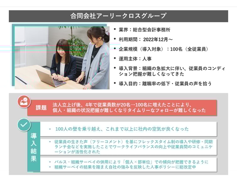 組織の急拡大で従業員のコンディション把握が難しくなる中、両サーベイを有効的に活用し、離職者数を半減させ、「100人の壁」を乗り越えた運用を人事責任者の阪本 紘子様にお話しを伺いました。