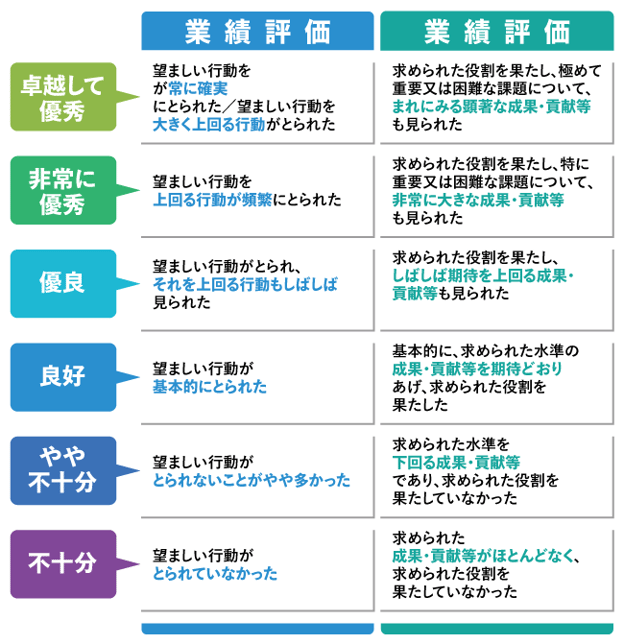 また、令和4年10月以降、能力や実績をより細かく的確に把握する観点から、人事評価の段階が原則として5段階から6段階に細分化されました。